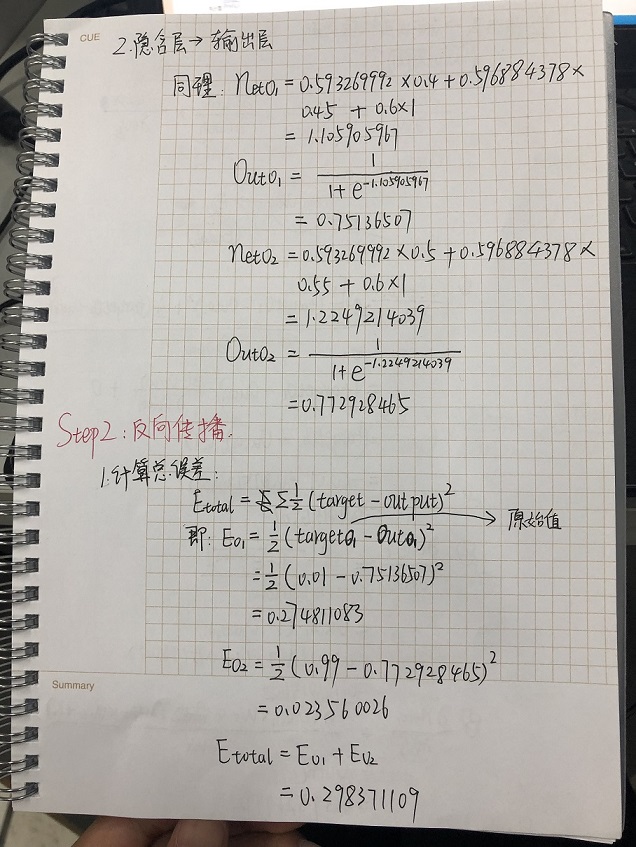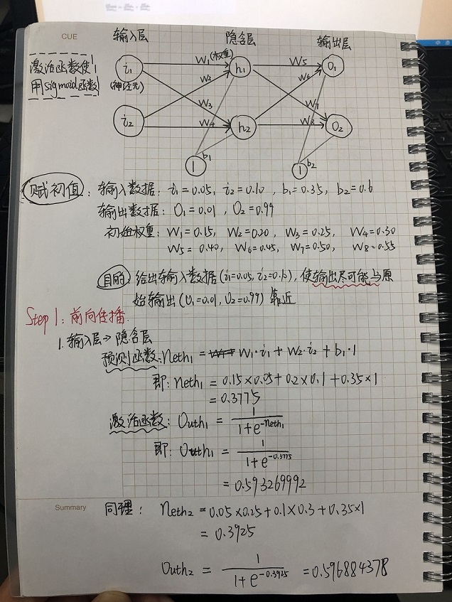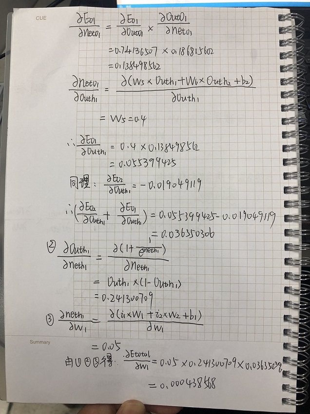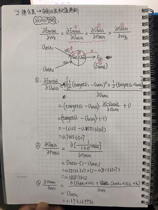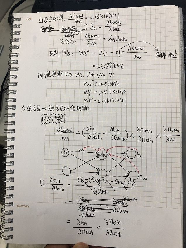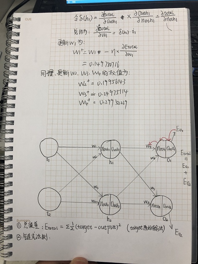 至此,我们已经推导出了反向传播算法。需要注意的是,我们刚刚推导出的训练规则是根据激活函数是sigmoid函数、平方和误差、全连接网络、批量梯度下降优化算法。如果激活函数不同、误差计算方式不同、网络连接结构不同、优化算法不同,则具体的训练规则也会不一样。但是无论怎样,训练规则的推导方式都是一样的,应用链式求导法则进行推导即可。