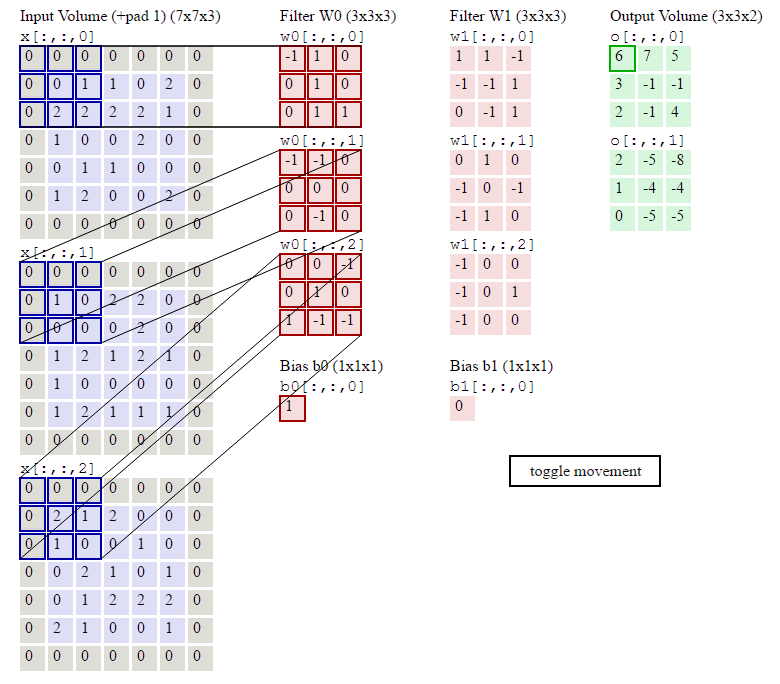 下面的动画显示了包含两个filter的卷积层的计算。我们可以看到7*7*3输入,经过两个3*3*3filter的卷积(步幅为2),得到了3*3*2的输出。另外我们也会看到下图的Zero padding是1,也就是在输入元素的周围补了一圈0。Zero padding对于图像边缘部分的特征提取是很有帮助的。